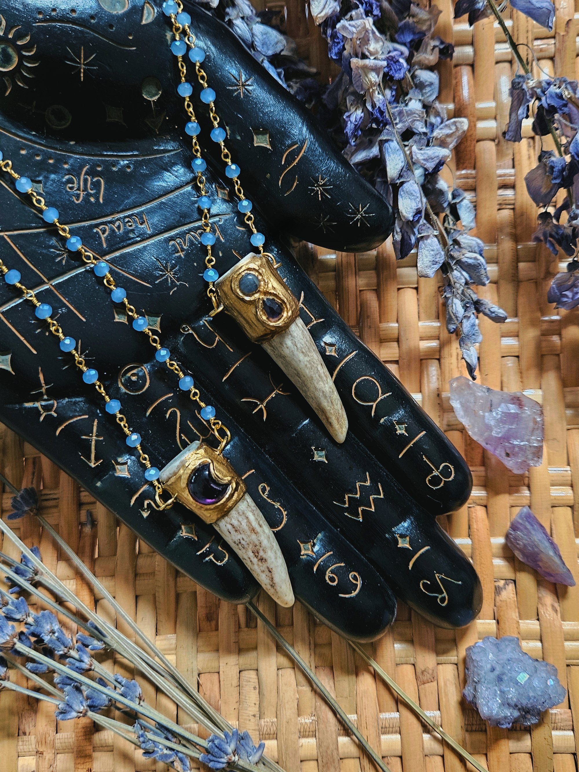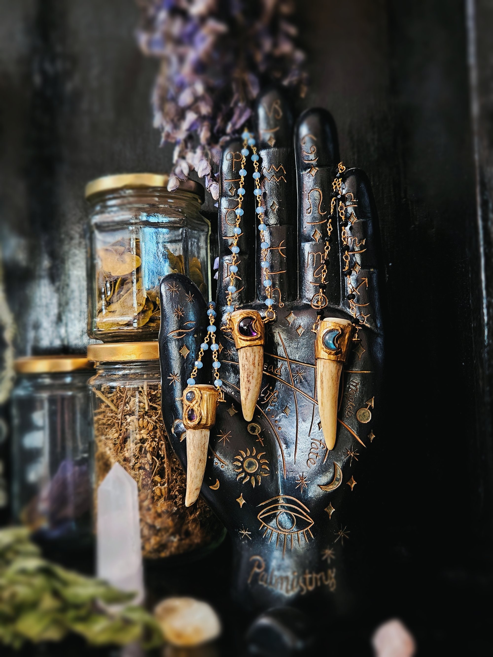 Deer antlers meet crystals and rosary chains for a touch of wild and sacred ✨️✨️📿🫎 Earthy, raw but with golden frames to make it modern ritual wear for those who feel connected to the wild 🫎🪶🌿