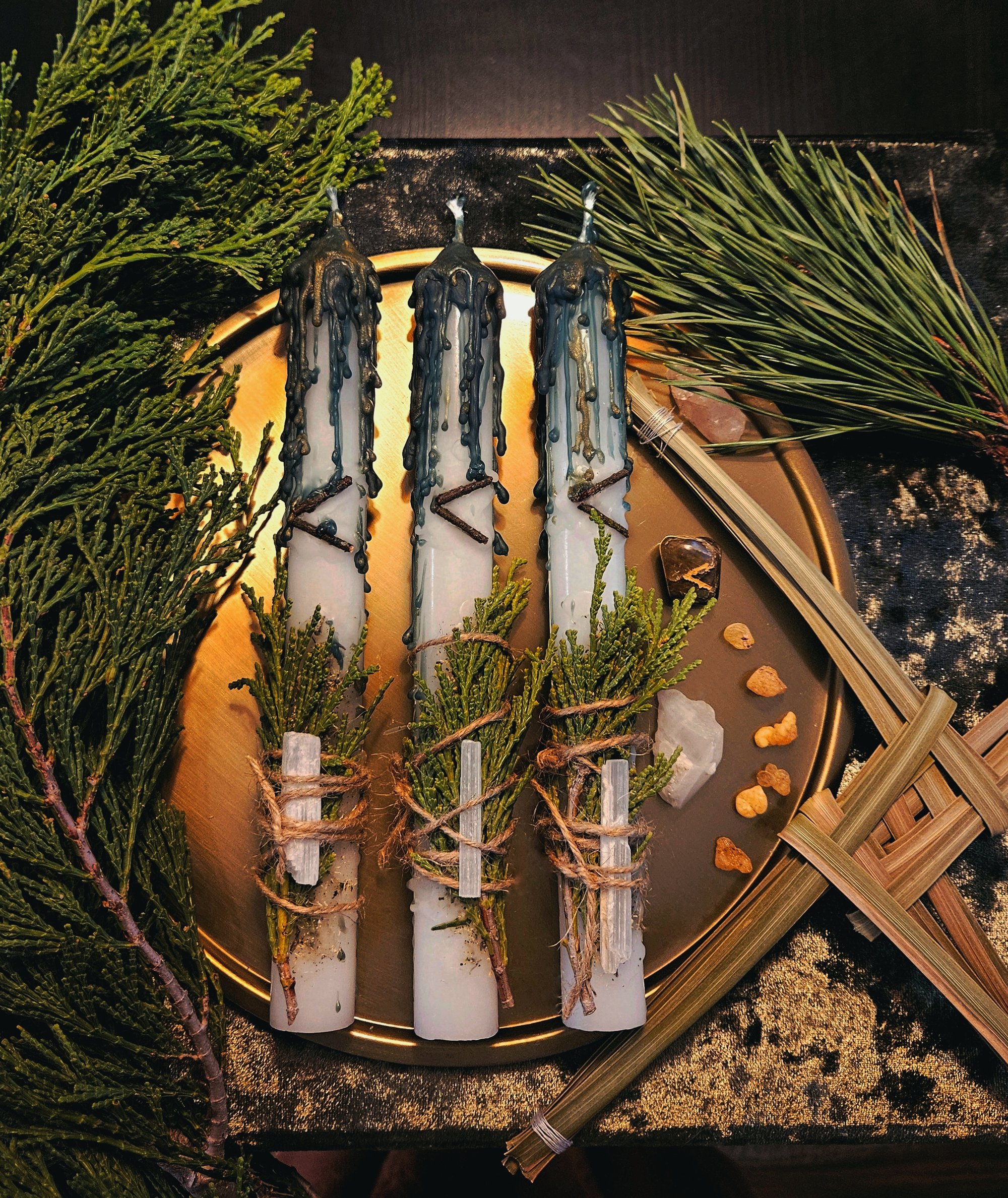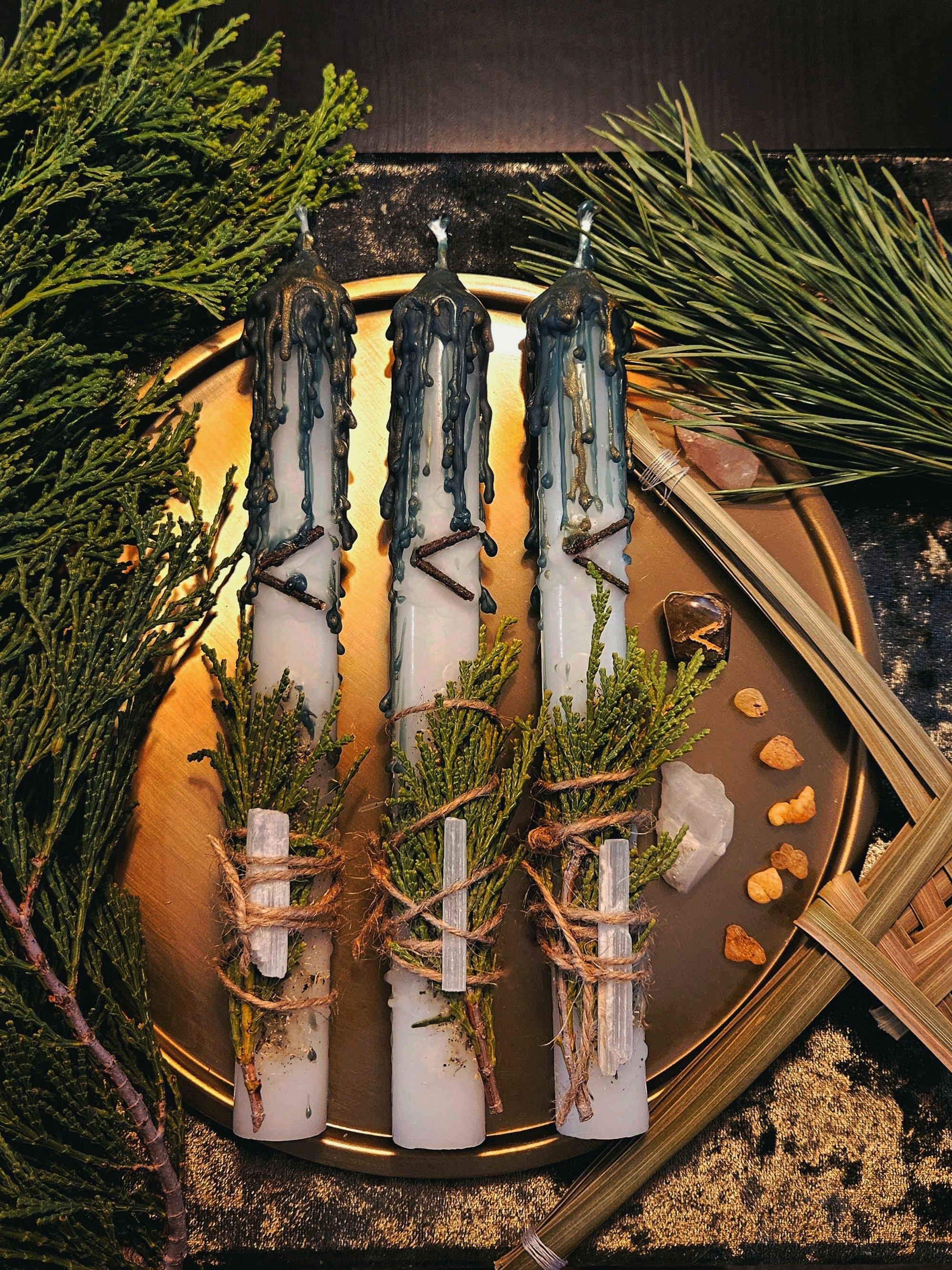 The candles are decorated with evergreen cedar branches and selenite pieces for purification, clearing and raising the vibration.