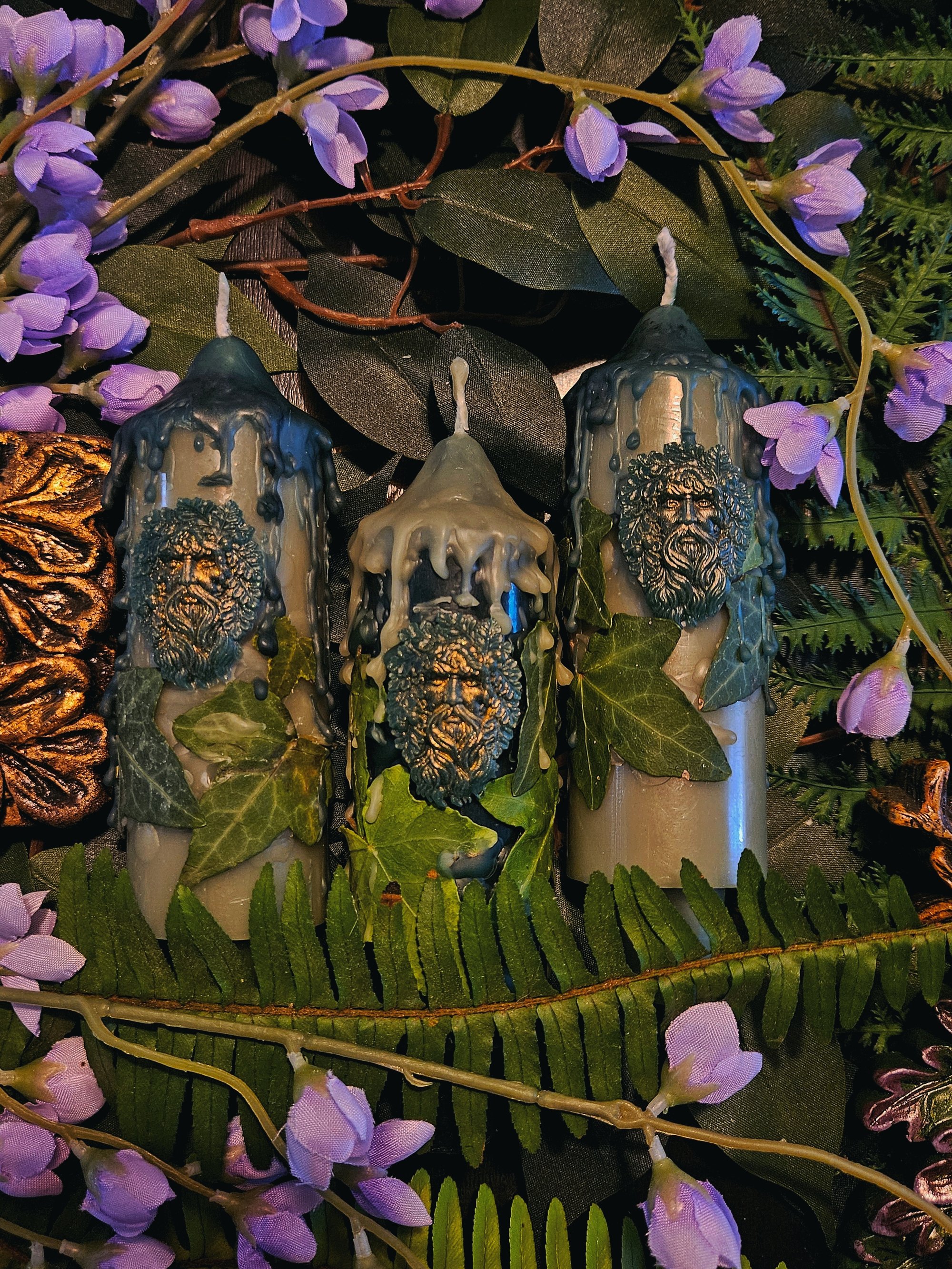 These candles are pillar candles but they are sized to fit a standard candle holder. They come in darker and lighter shades of green, each with a Green Man face and decorated with ivy leaves.